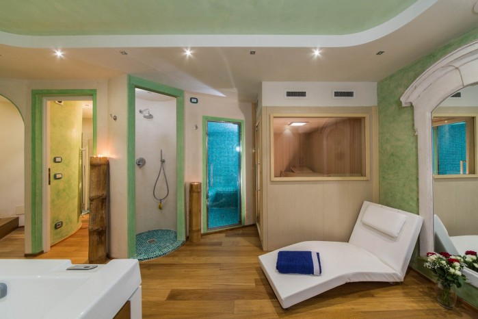 On the back side of the house, a Spa area with a Turkish bath, a sauna, a Jacuzzi and a gym occupies the whole lower floor.