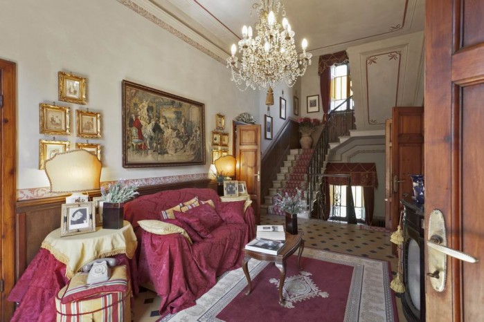 This superb villa, one of our best holiday home near Volterra, is located at the border of the ancient medieval village of Chianni, on a hill dominating the valley between Pisa and Volterra. Surrounded by forests, olive groves and vineyards, this enchanting holiday accommodation was built in the 1930s in Art Nouveau –Italian Liberty- style by the ancestor of today’s owner, a noble landowner. The house still maintains its original design, as can be seen from the façade, the balustrades and the window frames. Even the interior has maintained most of its 1930s atmosphere and style with antique furnishings, coats of arms, original decorations and frescoes.