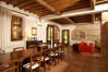 Ground Floor: large living room, with fireplace, with access to the terrace, fully equipped kitchen (gas hobs, oven, fridge freezer, dishwasher, toaster, kettle, microwave, coffee machine). 3 double bedrooms (on request can be set up as twin; one of these is a huge double bedroom with access to the garden: a very characteristic room with two terracotta tile and stone walls that were part of the original furnace), one bathroom with tub and shower head, one bathroom fitted with shower. Four steps lead down to another level where there is a double bedroom, a single bedroom, a living room with a single sofa bed and kitchenette, a bathroom with shower. Access to the second terrace.